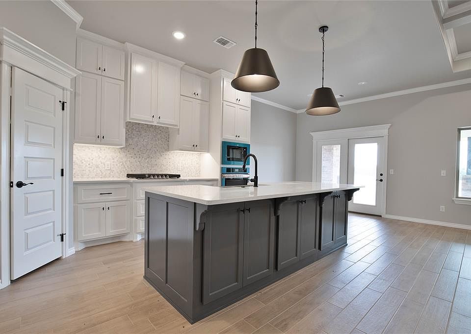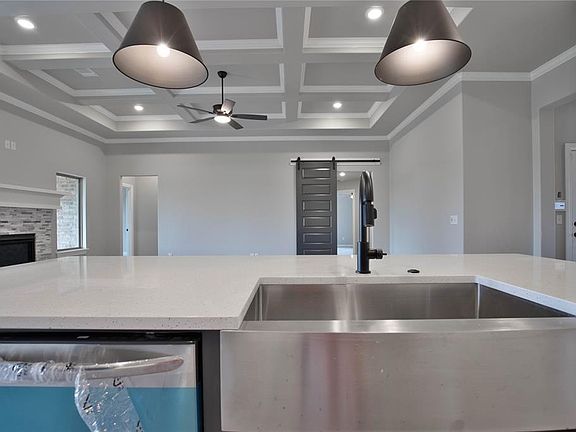 This home offers 4 bedrooms, 2 full baths, covered patios, a powder room, & a utility room! The great room boasts a beautiful coffered ceiling, large windows, a ceiling fan, crown molding, a barndoor, & wood-look tile. The kitchen embraces stunning pendant lighting, custom-built cabinets to the ceiling, stainless steel appliances, a walk-in pantry, tile backsplash, a center island, & 3 CM countertops! The primary suite hosts a sloped ceiling detail, windows, a ceiling fan, our cozy carpet finish, & TWO closets! The primary bath has separate vanities, a Jetta Whirlpool tub, a private water closet, & a walk-in shower. The covered outdoor living holds a wood-burning fireplace, a TV hookup, & a gas line for your grill. Other amenities include a tankless water heater, R-44 insulation, a whole home air filtration system, & more!
