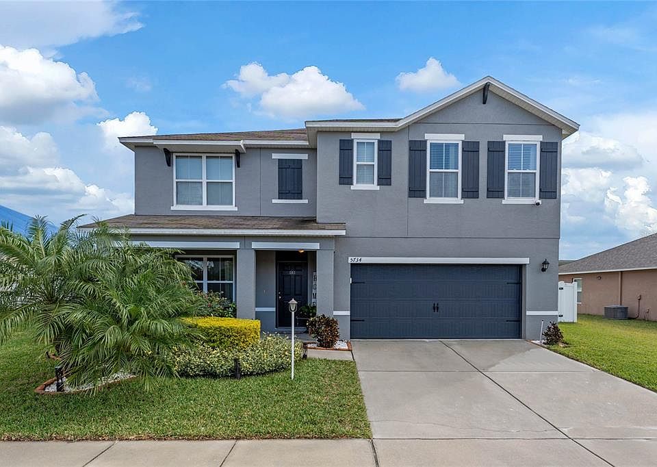 This two story, all concrete block constructed home has a large open-concept downstairs with a kitchen overlooking the living and dining room, next to the living room you will find a bedroom with full bathroom, ideal for visits or in-laws, kitchen comes equipped with a refrigerator, electric range, microwave and built-in dishwasher. The second floor features a flex room that provides an area great for an office, family room or play room, an expansive Master bedroom, three additional bedrooms and a third full bathroom, and a laundry room equipped with washer and dryer. Fenced backyard for your pets to play. Located less than 20 minutes away from Legoland, it's shopping, schools, and entertainment. LAKESIDE LANDINGS is a beautiful Pool Community with a lot of green space, a nature trail, and amenities.