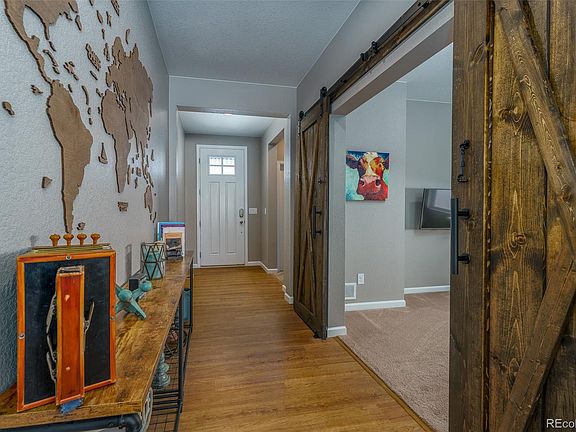 This charming home in Stone Creek Ranch within the Parker Community was built in 2020 and has a large backyard backing up to open space/dog run which is perfect for entertaining, playing games and many other activities. The home situated in a desirable neighborhood and features an open floor plan, upgraded Chef's kitchen, and a living room that showcases plenty of natural light. Numerous upgrades include a brand new iron and wood railing, upgraded lighting throughout the home and a fully finished basement with a wet bar, family room, full bath and bedroom. The spacious four-car garage is perfect for any car enthusiast or hobbyist, with plenty of room for storage and workspace, and is ideal for any homeowner looking for extra storage or a place to work on projects. The interior includes 3 bed/3 bath as well as a large office with new barnyard doors, a custom-made wooden world map (included), and a security system including 4 cameras (indoor and outdoor). The home has solar panels on the roof which reduce the energy cost to an average of $15 per month. The community has a private outdoor swimming pool and clubhouse. Located within close proximity to restaurants, running/biking trails, golf, shopping and all the wonderful activities that Colorado has to offer!