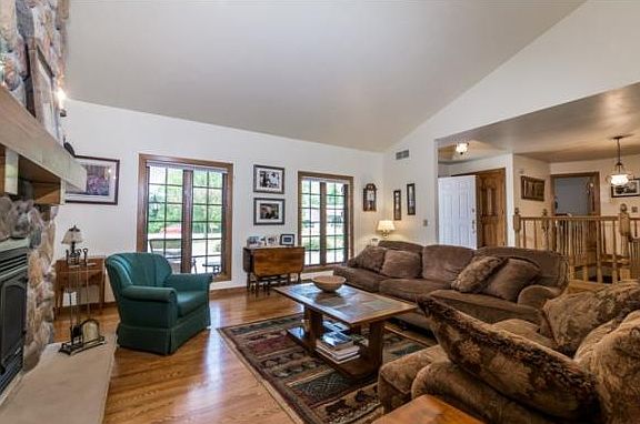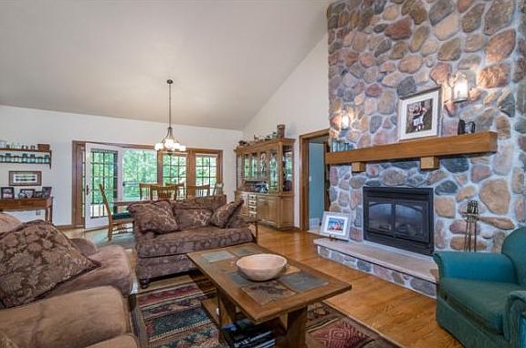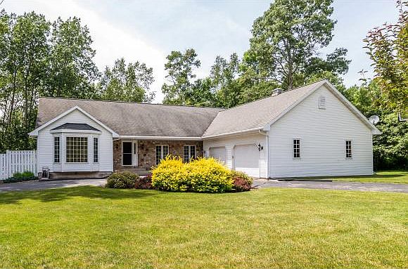 Meticulously maintained 4 bdrm ranch situated on 1.5 ac wooded setting! Open concept living/dining offers stunning floor-ceiling stone fireplace, cathedral ceiling & hardwood floors. Kitchen w/tiled floor & french doors leading to deck & paver patio overlooking gorgeous backyard landscape w/in-ground pool. Master suite w/walk-in closet, crown molding & full bath. LL family room & 3rd full bath.