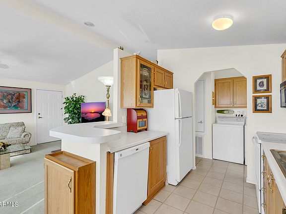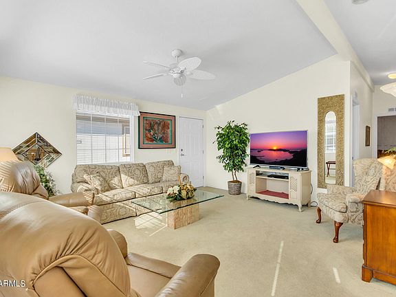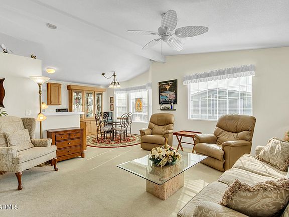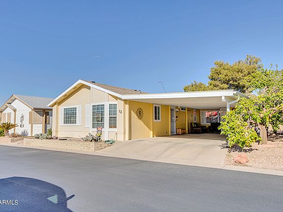 Beautiful and pristine 2 Bedroom, 2 Bath home is fully furnished and located in the popular Wells 55+ community. Enjoy the many upgrades including new vinyl windows in 2018, updated plumbing, exterior painting and more. Lots of room outside with a two car covered carport, extended covered patio and storage shed. Active adult community, heated pool, spa, club house, pickleball, tennis, shuffleboard, greenbelt, putting green and much more. Near golf courses, hiking, restaurants, shopping and freeways for easy access to get around the valley. NO PAD FEE!
