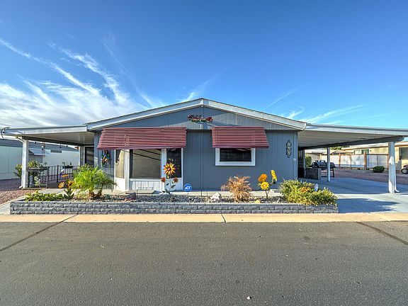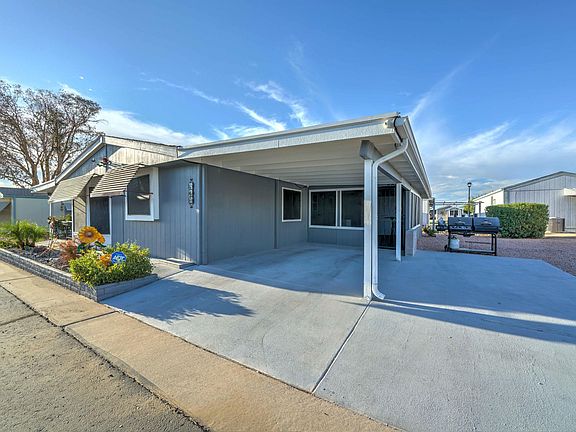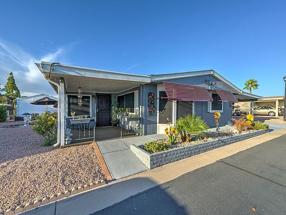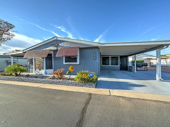 Located in the master planned, active adult community of The Wells, where vacation is a lifestyle, this 26x40 Cavco + 20x13 Screened in patio + 12x8 storage is the perfect home for winter visitors & year-round residents alike! This well-maintained home features granite countertops, stainless steel appliances, inside laundry, new flooring and natural light. The Wells is a gated community w/ red brick clubhouse, library, fitness center, billiards room w/ 6 regulation size pool tables, heated swimming pool/jacuzzi, tennis courts, putting green, shuffleboard areas, tons of activities/community events & is conveniently located close to freeways, shopping/dining & far enough removed to be beyond the noise of traffic & the hustle & bustle of the city. Monthly HOA include water/sewer/trash & Cox.