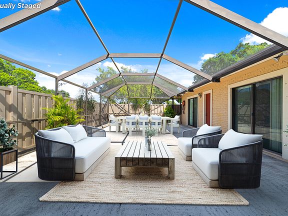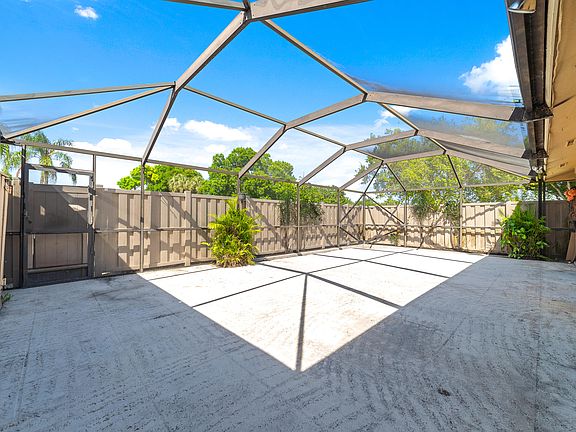 Welcome home to this corner unit 3 bedroom 2 bathroom townhome located in the highly sought after Westwood Gardens of Palm Beach Gardens. As soon as you enter, you immediately notice the soaring high ceilings and abundant natural light. Spacious layout with a split bedroom floor plan for added privacy. The home features tile flooring throughout the living areas with finished concrete in the bedrooms, just waiting for your personal touch. The primary suite boasts ample closet space, vaulted ceilings and access to the patio area. The primary bath provides tons of counter space, large vanity area and combo tub/shower. Both secondary bedrooms have high ceilings, ample storage space and access to the patio. The large kitchen with breakfast bar opens out to the family room, perfect for entertaining. Out in the courtyard, the possibilities are endless. The high screened enclosure and privacy fence create your own private entertaining or relaxing space with room for endless outdoor entertaining possibilities. Westwood Gardens offers a large pool area, clubhouse, playground, pickleball, tennis and basketball courts with a terrific location in the heart of Palm Beach Gardens. This opportunity provides a fantastic location not far from gorgeous beaches, shopping and quick access to highways. Please make sure to check out the 3D virtual walk through and schedule an appointment today!
