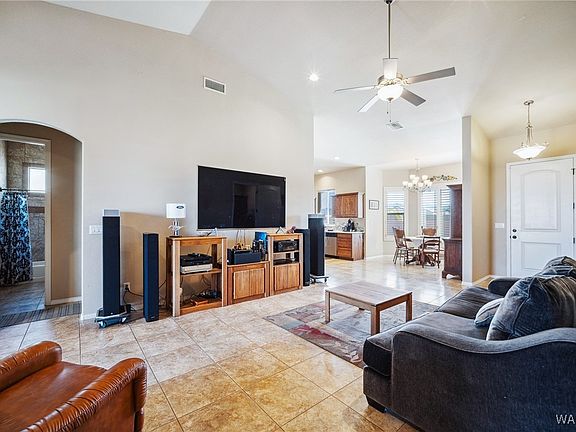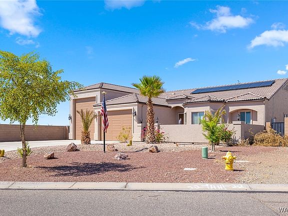 Let's talk about amenities...fully owned solar, air-conditioned RV garage with rear door, dual water softener system, and a putting green in the backyard to name a handful. This home features an open concept layout with grand vaulted ceilings, granite countertops, stainless steel appliances, upgraded lighting package, tile flooring throughout the main living space, and a west-facing backyard, perfect for soaking up the famous Arizona sunsets. With 1071 sq.ft. of combined garage space to work with, there is plenty of room for all of your toys. Located in the Twin Palms Estates in close proximity to golf courses, the Colorado River and open desert, this is a great home ready for new ownership.