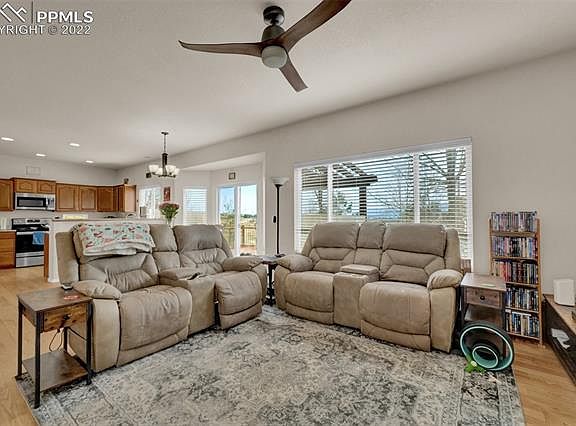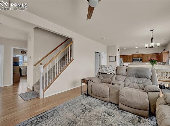 Beautiful Briargate home backing to a park with sweeping views of Pikes Peak and the front range. Nestled within the popular Fairfax neighborhood on a lovely cul de sac, this home has plenty of desirable features. Gorgeous stucco exterior with tile roof and a walk out basement, located on a large lot with great views and mature trees. Enter the home through the great room with a cozy fireplace, nice hardwood floors, and an attached office/flex room/main level bedroom. The great room flows nicely into the dining room and kitchen which features newer stainless steel appliances and granite countertops. The dining room offers a walkout onto a massive, two-tier deck where you can enjoy the views, entertain or relax, and grill using the newly installed gas line. Upstairs offers a spacious primary bedroom with attached 5 piece bathroom, two other large bedrooms with sizable closet space for both, secondary full bathroom, and a conveniently placed laundry room with brand new washer and dryer. The walkout basement has been recently converted into a home gym which would rival most commercial gyms! It is also complete with an additional bedroom and bathroom and extra storage space. Additional features include brand new furnace and central air, brand new fence, new garage door hardware, new blinds throughout, new ceiling fans and light fixtures, and the gas line on the back deck for an outdoor grill. The park behind the house offers access to miles of trails with stunning views. With easy access to shopping, dining, hospitals, and schools, this home has all the amenities you need!