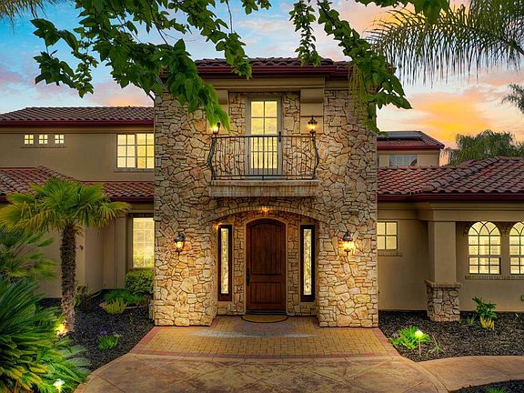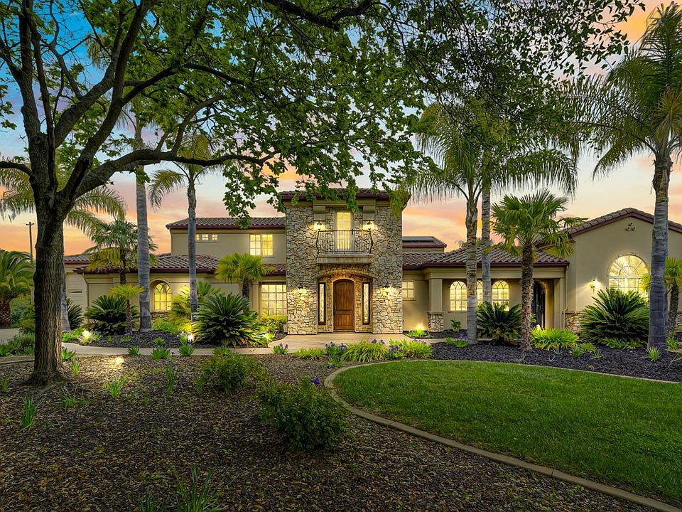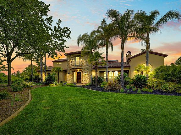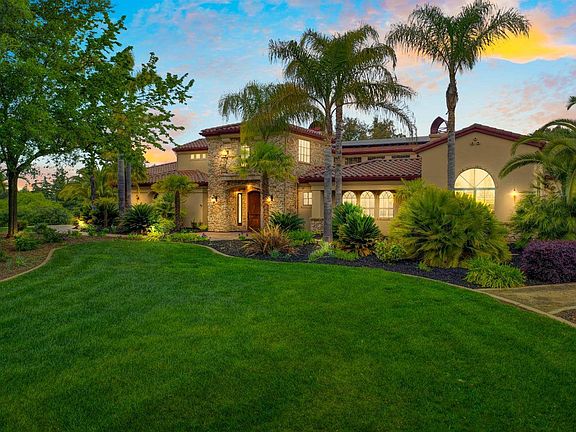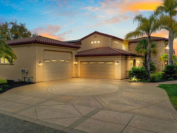 Welcome home to this custom Tuscan style estate on a unique 2.4 acre lot with views of the Sierras. This magnificent home features a chef's dream kitchen,a great room with a large fireplace and an exquisite master suite and bath. The home is centered around an open air courtyard creating natural light throughout with the ambiance of an Italian villa. Downstairs also features an executive office and a beautiful sunroom. The 2nd floor features two bedrooms with full baths and large built-in closets. A library room and large bonus/game room completes the upstairs area. The back of the home reveals a private entertainment paradise with a covered patio, beautiful waterfall, fire pit, and spa surrounded by mature palms. The estate features large dual garages ready for cars, RV's, or boats. The home is powered by an owned solar system. Folsom lake, the American River, golf, biking, and fine dining are all conveniently located. Escape to the adventure and relaxation of resort style living!