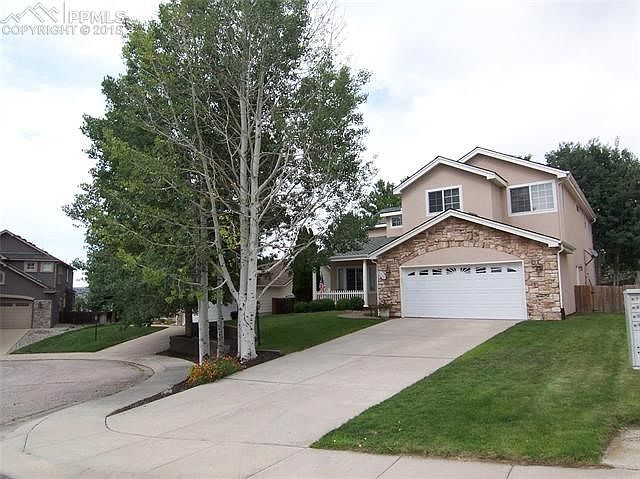Simply stunning. Cul-de-sac home. Paved trail behind house. Oasis like backyard w/pebble stoned patio, trees all around and a koi pond. Front porch is inviting and spacious with a view of Pikes Peak. Master Bedroom has it's own good sized, warm and intimate balcony. A large loft upstairs. The living room has high ceilings with a wall of windows for great natural lighting, built in shelving, and a doublesided fireplace that shows in front room also.