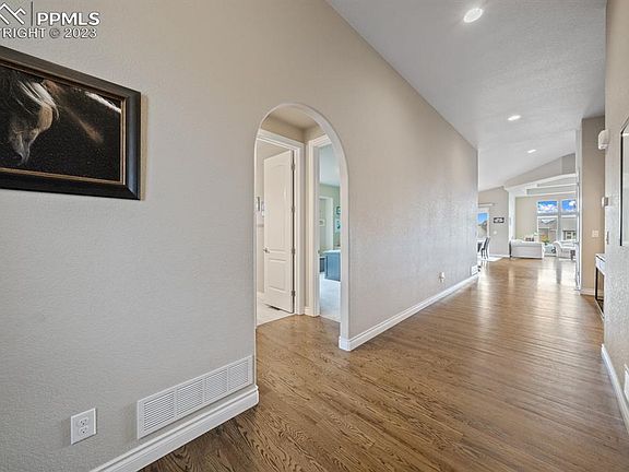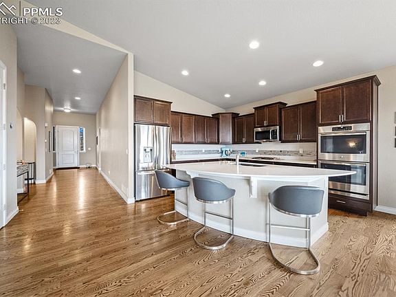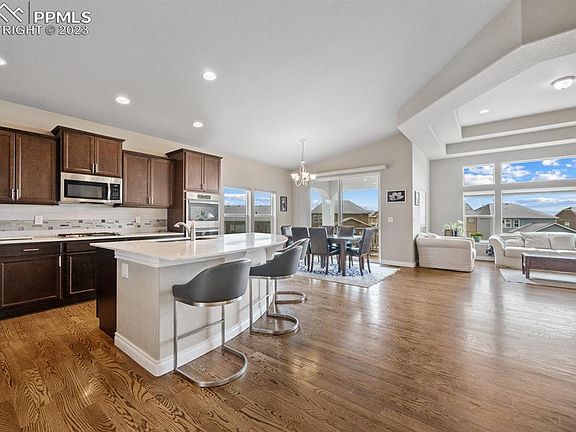 Nestled in the heart of a charming Colorado Springs neighborhood, this beautiful 5-bedroom, 4-bathroom residential property boasts an impressive 4,479 square feet of living space and is the perfect place to call home. This ranch-style home features a modern design, with gorgeous hardwood floors throughout, and an open concept kitchen, living, and dining area that is perfect for entertaining. The kitchen is a chef's dream, with sleek quartz countertops, a double oven, lots of storage, and a spacious kitchen island that provides the perfect space for preparing meals and hosting dinner parties. The high-end finishes and modern design make this space a showstopper. The master bedroom is spacious and inviting, with a luxurious walk-in closet that offers ample storage space for all your clothing and accessories. The property also includes two additional generously sized bedrooms on the main level. The fully finished basement includes two additional bedrooms and a full bath, making it the perfect space for accommodating family and guests. The property has been thoughtfully designed with upgrades such as an insulated garage door, acrylic stucco, and deluxe turf in the backyard, creating a beautiful outdoor space that's perfect for relaxing and entertaining. The property also has a high-performance energy rating, making it a smart and energy-efficient choice for homeowners. This property is a true gem with stunning upgrades, thoughtful design, and luxurious finishes throughout.