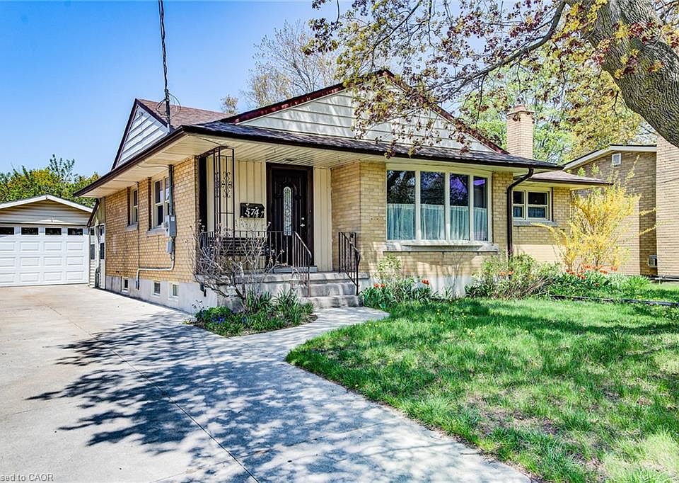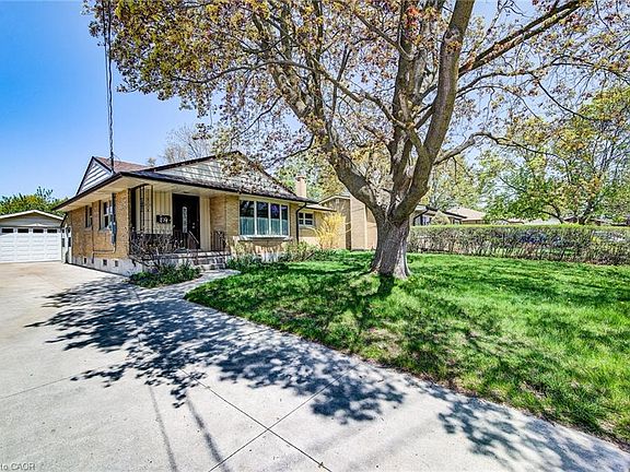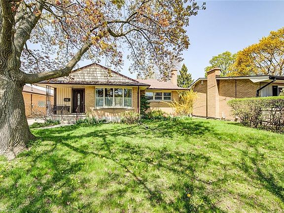 This charming 2-bed, 1.1-bath brick bungalow in the desirable Rosemount area has been lovingly maintained and boasts great curb appeal! Enjoy the covered front porch in the shade of the large maple tree, and watch the world go by beyond the large front yard. Inside, a small foyer leads into an extended kitchen featuring new light fixtures (2025), beautiful butcher block counters and a plethora of cabinets (2018) including a large pantry. The large living room features bay windows which flood the room with natural light. Directly opposite, a third bedroom was opened up into a dining room, but could easily be converted back. The primary bedroom features original hardwood floors and a large closet, while the second bedroom features laminate floors (2018) and a view of the backyard gardens. A full bath is conveniently located beside the two bedrooms. Downstairs, a large finished rec room features new laminate floors (2025) and a gas fireplace. You’ll be spoiled for storage in 2 other rooms with built-in shelves, in addition to a separate cold storage. The spacious utility room houses the laundry facility with laundry tub and a small powder room, and the long non-load bearing wall may be taken down to expand the rec room if desired. Outside, the detached garage is fronted by an extra long poured concrete driveway that can accommodate multiple vehicles and/or trailers/recreation vehicles. A large 8’x12’ shed (2019) featuring a small 8’x4’ deck is perfect for gardeners, hobbyists, even more storage, or as a dream playhouse. Extensive perennial gardens front and back will give you years of blooms to enjoy. This generous property is close to many amenities, minutes to the expressway, walkable to downtown Kitchener, and surrounded by parks, trails and green spaces, and it’s also on a bus route. This property has everything!