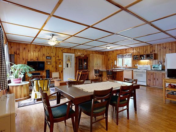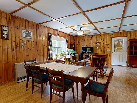 The home showcases beautiful wood floors and warm knotty pine walls and ceilings in select rooms, creating a cozy, rustic atmosphere. Step outside onto the inviting farmer's porch and unwind on quiet summer nights, taking in the peaceful surroundings.