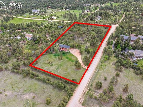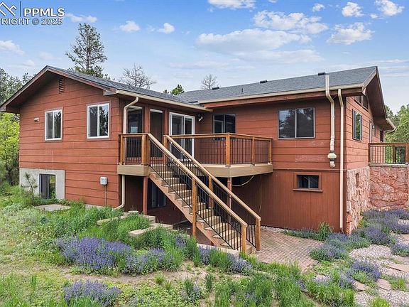 Looking for mountain views? This home has incredible views from the Air Force Academy to Pikes Peak. Located in Black Forest on nearly 5 acres, this home is surrounded by an abundance of trees, tranquility and privacy. Convenient location, just 10 minutes to services and I-25. Ranch style floorplan with a great room concept. Kitchen was remodeled in 2022 with new cabinetry, island, breakfast bar, flooring, light fixtures and stainless appliances. Eating area in kitchen can be for used casual or formal dining. Composite deck for low maintenance is accessed from the kitchen, perfect for outdoor dining. Living room is large with an open/flexible design, vaulted wood plank ceiling, space for a formal dining area, seating area with stone fireplace and views from every window. Primary bedroom on main level has a private full bath. 2 additional bedrooms and 3/4 bath. Walkout basement has an office, bedroom and large family/media room, 3/4 bath and mountain views. Oversized 2 car garage, extra space for workshop/storage.