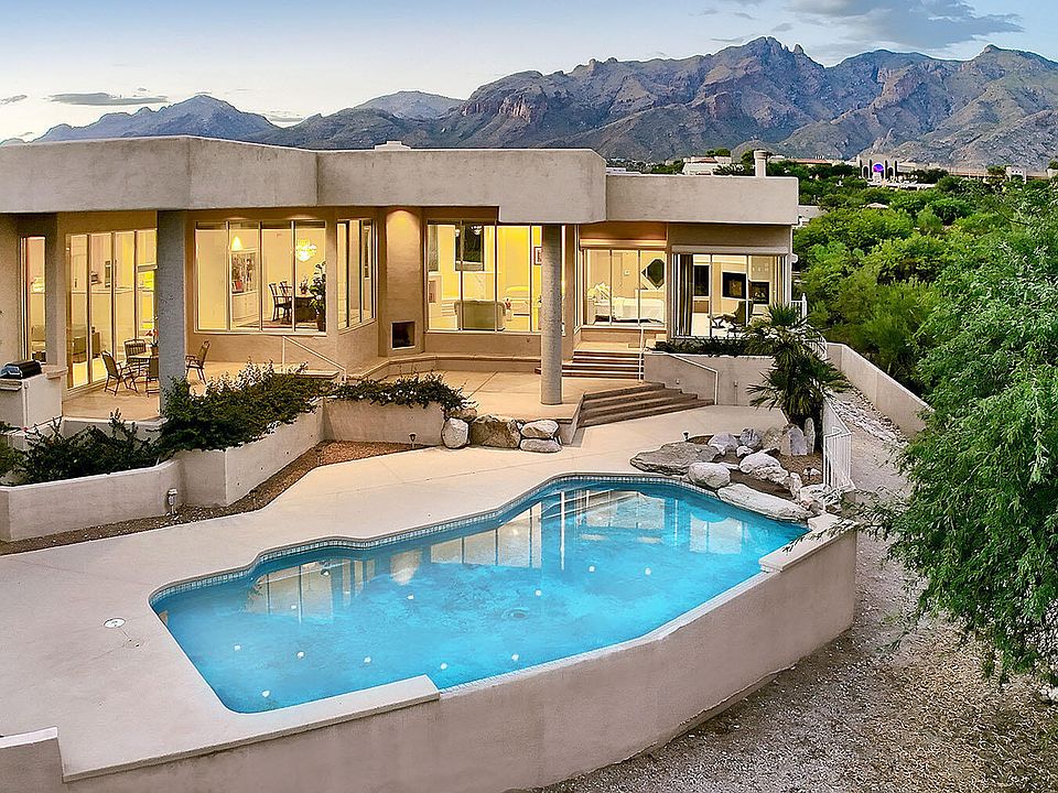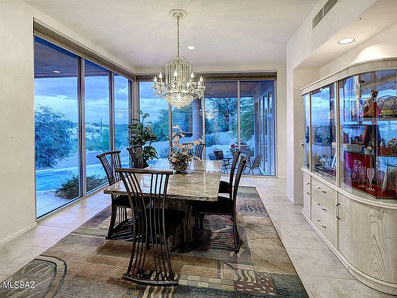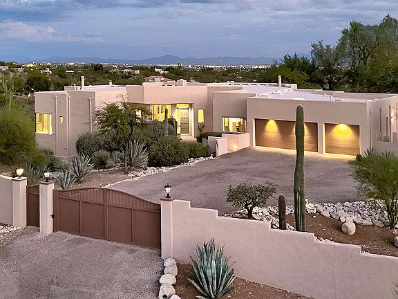 Stunning contemporary w/city & mtn. views in Catalina Foothills Est #3. Private motorized gates, courtyard entry, exquisite living rm w/15 ft. high ceilings, floor to ceiling windows, formal dining rm w/chandelier, large gourmet island kitchen w/granite countertops, gas stove top, dbl. ovens, 2 dishwashers, Sub Zero, prep sink, breakfast bar & lovely breakfast area, desk, pantry, beautiful tile floors, family rm w/fireplace, 4 bedrooms & 3.5 baths in main house (3608 sq.ft) including primary bedroom w/fireplace, sitting area, walls of windows, lux. bath w/marble countertops & floors, dbl vanities, Jacuzzi tub, separate shower & very large walk in closet & laundry rm + guest house w/bath(730 sq.ft.). Fabulous bkyd w/ covered patio, pool, landscaping, 4 car garage, Dist. 16 schools & views!