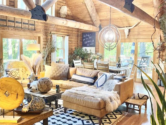 Tucked back in its own hideaway sits this Gastineau solid oak log home that will wow you with all of its stunning finishes and views. If that's not enough you can sit on the enormous wrap around deck & enjoy the private wooded views the 5.3 acres has to offer. This 4 bed/4 bath home has upgraded finishes everywhere, from concrete counters, raw oak beams, hardwoods and a gourmet kitchen to wrap around porches, a guest suite & rec room in the finished lower level. This home is a winner for all seasons, spring and summer you'll ride the trails on your ATVS, play in the cleared meadows and take a dip in the creek, in the fall you can hunt on your own property and in the winter you will feel cozy wrapped in a blanket by the oversized, wood burning fireplace.