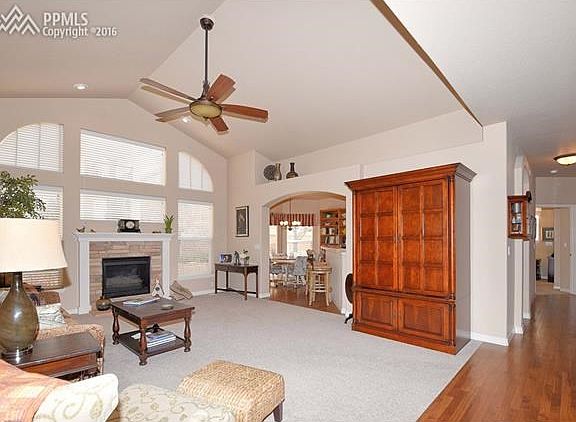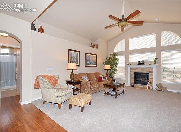 Stunning ranch style home located in a maintenance free community. Located at the end of a cul-de-sac with wonderful views of Pikes Peak. One level living and impeccably maintained. Gorgeous hardwood floors, formal dining, gas fireplace, plantation shutters, main level office with french doors, and lots of natural light. Spacious master suite with sitting area, adjoining 5 pc bath and walk in closet. Additional (2nd) bedroom on the main. Kitchen boasts hardwoods, white appliances, pantry, counter/breakfast bar and...