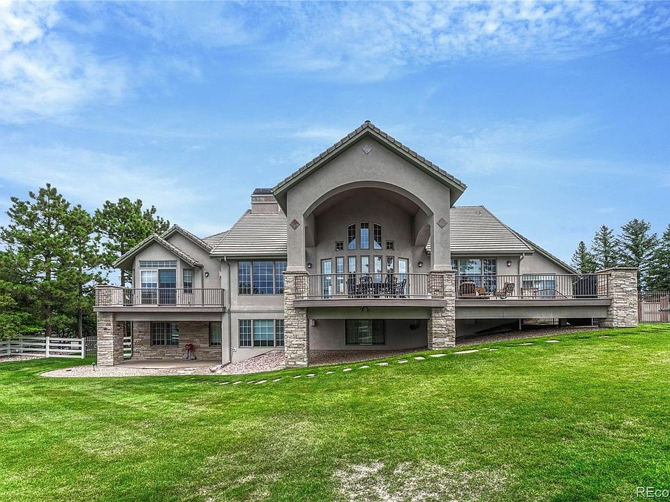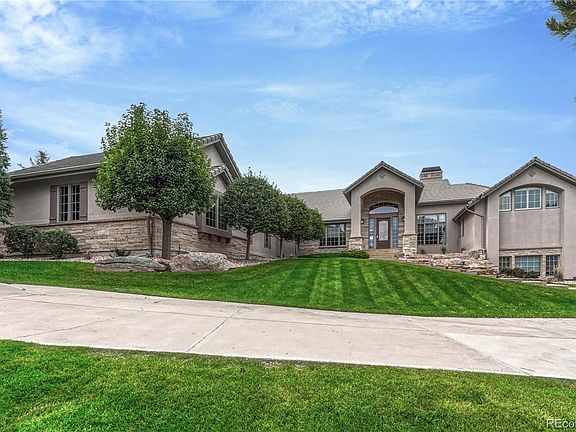 Exceptional 2.5 Acre Estate in High Prairie Farms. This home has it all! Indulge in the Colorado lifestyle you’ve always dreamed of in this stately 4-bed, 5-bath Parker residence on a sprawling 2.5-acre lot! A long driveway bordered by towering trees leads to this picture-perfect abode set well back from the street, a true gem exquisitely maintained by the original owner. Discover a captivating interior that exudes sophistication with soaring ceilings, designer lighting fixtures, impressive millwork, and beautiful hardwood flooring. Inviting fireplaces radiate a welcoming warmth across the living and dining areas, extending to the Great Room highlighted by a full wall of windows framing idyllic mountain views. Designed for an exceptional culinary experience, the gourmet-style kitchen sports top-notch stainless steel appliances, finely crafted cabinetry, an oversized pantry, gleaming granite countertops, a multi-seater island, and a scenic breakfast nook with access to the extensive deck. After a busy day, escape to the restful proportions of the four retreats, two of which are located on the lower level. Double doors open to the magnificent primary suite pampering you with another hearth, an overlooking balcony, and an opulent ensuite with a window-side soaking tub, heated floors and a frameless shower.(Heated floors in the main level guest suite bath too) Entertainment abounds in the generous basement showcasing a state-of-the-art movie theater, a game room, a fireplace-warmed recreational room with a wet bar and wine cellar, and a covered patio that opens to the serene, exceptionally large fenced-in backyard. Other notables include an executive home office, a large laundry room, an enclosed dog run, and a heated 4-car garage with a doggy bath in the corner. Let your real estate dreams come true by taking a tour today! Concrete tile roof, two new furnaces, two new humidifiers, two newer water heaters. Measurements are approximate. Senior tax rate.