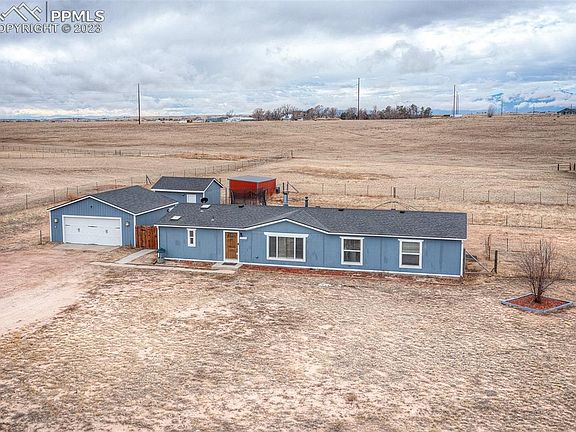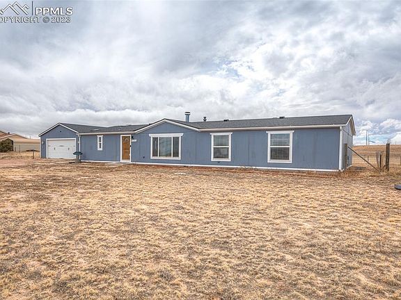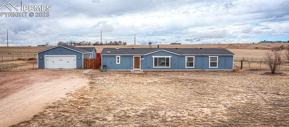 Welcome to this gorgeous home with land, incredible sunsets, and beautiful mountain views just outside of Peyton and only minutes from shopping and dining areas. Located in the desirable Southfork neighborhood on 2.5 acres, this property provides a little extra space and will appeal to anyone looking for neighbors you can see, but not hear. A large, open concept living area with a wooden fireplace great you as you enter and flows into the dining area and kitchen. The kitchen is upgraded with granite countertops and includes a French-door refrigerator and four-burner gas stove, among other things. The master bedroom has ample space and includes a bonus/flex room that would make a great office. nursery, or library right. The 5-piece master bath has a double vanity with granite counter tops, a free-standing shower, and a large tub. The two other good-sized bedrooms come with walk-in closets. The property is zoned to allow for horses, goats, chickens, etc. Two detached garages (1 car and 2 car) round out this beautiful home on amazing acreage! Virtual Tour available. Come check it out today!