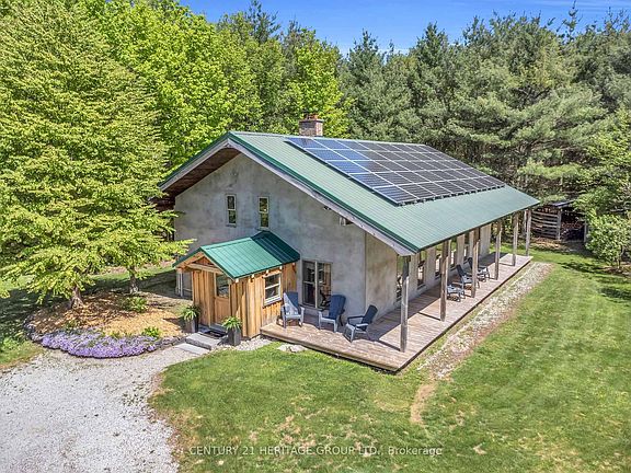 Discover a truly one-of-a-kind custom straw-bale home, nestled in nearly 4 acres of white pine and sugar maple forest in rural Oro-Medonte. Built in 2007 using post-and-beam techniques and designed with sustainability at its core, this environmentally friendly home is made from renewable materials and offers exceptional thermal comfort, excellent insulation, and a reduced carbon footprint. Step inside to soaring open-to-above ceilings and a stunning floor-to-ceiling wood-burning fireplace that anchors the heart of the home. This bungaloft features extraordinary craftsmanship, including hand-carved white pine railings sourced from the property, solid wood kitchen cabinetry, and artisanal hand-poured concrete countertops. The main level offers the ease of bungalow living and is heated with hydronic in-floor heating for year-round comfort. Upstairs, you'll find two spacious bedrooms plus a versatile third room perfect for a home office or den. Enjoy environmental and financial benefits from owned solar panels installed on a durable metal roof, providing annual income. A 670 sq ft heated and insulated workshop with a steel roof and in-floor heating is ideal for hobbyists, entrepreneurs, and serious DIY'ers. Additional features include a dog kennel, a red cedar wood-burning sauna nestled in the forest for a peaceful retreat, and a charming maple syrup shack using sap collected from trees on the property adding a sweet, authentic touch to your rural lifestyle. More than just a house, this is a lifestyle rooted in environmentally friendly living, natural beauty, and artisanal design. Conveniently located about 20 minutes from Barrie, Orillia, and Midland, with easy access to ski hills, lakes, county forests, golf courses, trails, and more. Don't miss this rare countryside gem.