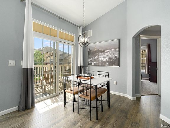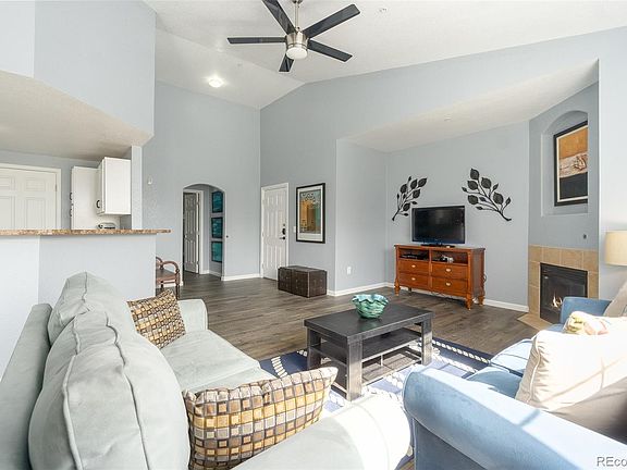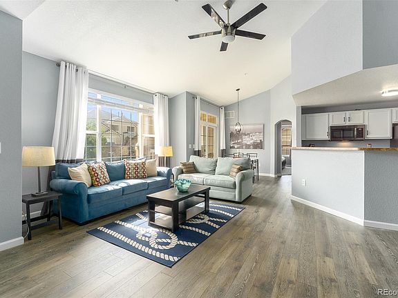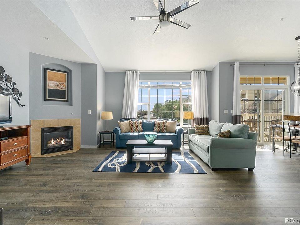 Rarely available 3 bedroom Penthouse condo in First Creek Farms. This condo boasts a large open great room with vaulted ceilings. The beautiful laminate flooring is brand new (installed last week) and runs through the entire great room and master bedroom! There is a natural gas fireplace with a blower, in the living room to warm you up on the cold days and a covered balcony off the eating space, to enjoy the terrific Colorado weather most of the year. The kitchen has a brand new refrigerator and the stove, microwave oven & dishwasher are 1 year old. The breakfast bar allows sitting at the kitchen and talking to the family cook. There is a laundry room off of the kitchen with room for storage. The washer and dryer are included. The master bedroom is a nice size, has vaulted ceilings, a walk-in closet, a very private balcony with a storage closet and a 4 piece master bathroom. On the other side of the condo there are 2 additional bedrooms that are carpeted and have large southern facing windows for great natural light. They share a full bath in the hallway between them. There is space for a tech area/desk in this hallway. The third bedroom has a walk-in closet. This unit is on the SE corner of the building (gets great light) and no one lives above you! There is an alarm system on all windows and doors, monitored by ADT. A Nest thermostat has been installed. The chandelier is brand new and the ceiling fan/light is about a year old! There is an additional storage unit on the third floor. HOA provides 2 parking spaces in this gated community. Great amenities including the swimming pool, hot tub & fitness center. Close to DIA, the Gaylord, grocery store, highway access, Singletree Park, trails, off leash dog area and playground. Next to Parking Spots-they have a shuttle to DIA! These three bedroom units go fast! Don't miss out!