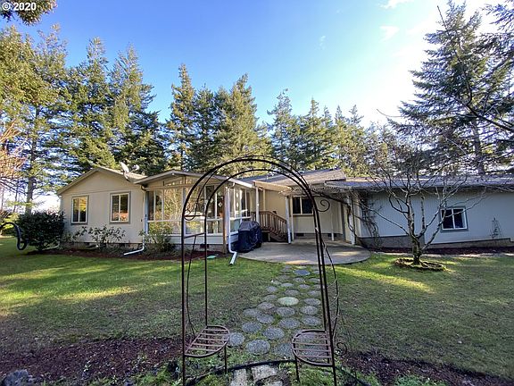 BANDON RESORT AREA SUPER WELL MAINTAINED 2001 Marlette on 2.8 wooded acres with oversized attached finished triple car garage, 24 x 36 metal shop, pasture area(currently unfenced), granite kitchen plus additional family room plus sun room!, metal carport, 2 cute convenient electric sheds, Garden Shed, well logged in strong at 15 gpm!, lovely yard, fruit trees, great room with architectural interest & light filled home with tons of storage make this a sweet spot indeed!