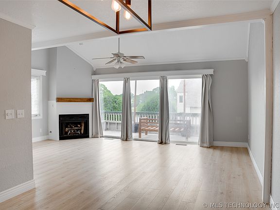 This airy corner condo is full of natural light with a spectacular view of old growth trees, Minshall Park pond and a nature trail. The vaulted family room with fireplace and updated luxury vinyl floors flows to a dining area and to a deck that is perfect for relaxing and enjoying a tree house feel. An updated kitchen with stainless appliances also flows to the dining room with the same luxury vinyl floors and opens to the staircase and lower level providing even more natural light. An office on the main level also has LV floors and has French doors that lead to a private patio. The office could easily transform into a guest room with hall bath access. Second bedroom on main level also has a vaulted ceiling and walk-in closet. The hall bath has been updated. A dramatic and spacious primary bedroom is on the third level and also features a vaulted ceiling, lots of windows with views and walk-in closet. The updated primary bath has tiled shower. The two car garage has a large closet also for storage in addition to floored attic storage. Full sized laundry room. Gorgeous wooden staircase. Gated Granite Hill provides a more care free lifestyle with no exterior maintenance, a community pool and the privacy that comes from a small community. The South Tulsa location is a bit of a hidden gem and is close to shopping, restaurants and of course the park.
