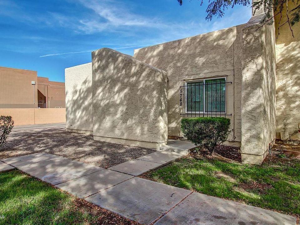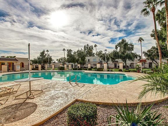 Nice clean single level town home w/ stainless steel appliances. Nice end unit with newer cabinets and counters. Upgraded tile flooring, newer carpeting, freshly painted, and upgraded bathrooms with Jacuzzi tub! Community pool and walking distance to Fry's supermarket. Ask about special financing.