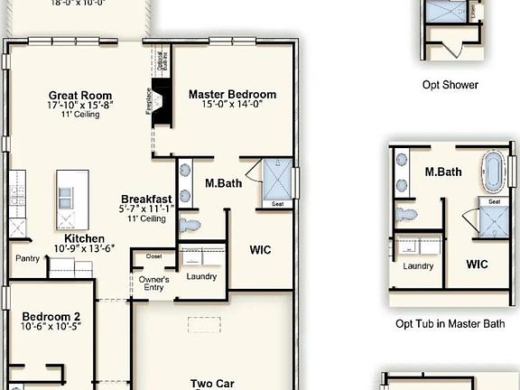 - All Bedrooms Down, Split Bedroom Plan, Luxury Primary Bath, Smooth Ceiling, High Ceilings, Den/Great Room, Kitchen, Primary Bedroom, 2nd Bedroom, 3rd Bedroom, 2 or More Baths, Laundry Room, Breakfast Room