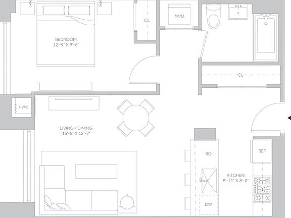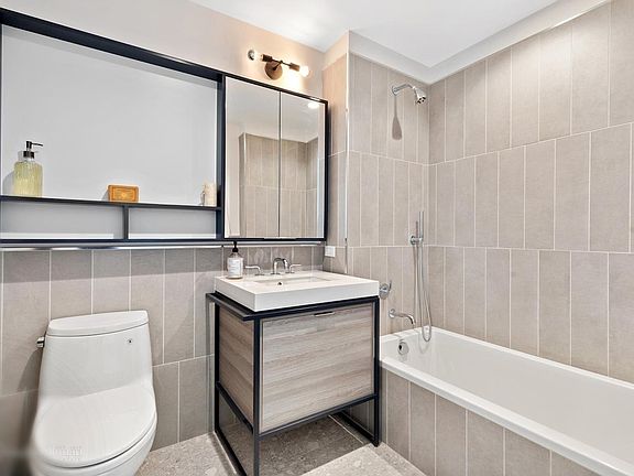Get ready to live large at 575 Fourth Avenue in vibrant South Park Slope. This stunning one bedroom in a new development building feels like living in your own private club. This luxury home is loaded with features: in-unit washer and dryer, open living and dining area and kitchen with custom walnut cabinets, top-of-the-line Thermador and Bosch appliances, slick Blum hardware with soft-close drawers and doors, and a stunning Alleanza quartz countertop with matching backsplash. The kitchen's seated island flows into the living and dining space. The primary bedroom suite features the custom floor-to-ceiling windows, gorgeous 7" engineered European oak wood flooring, and an energy-efficient, multi-zone heating and cooling system you control.