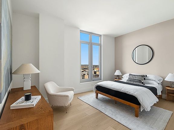 Residence 8F, is a split two-bedroom, two-full bath corner unit with open concept kitchen, separate dining and living room. Enjoy your private 265sf wrap around balcony, which is easily accessible from the living room. Inside floor-to-ceiling double-paned windows facing Park Slope to the east and The Verrazano Bridge to the South bring in abundant light. Unit finishes include a 7" European oak wood flooring, a custom kitchen with walnut cabinetry, fully integrated Thermador and Bosch appliance package, Blum German hardware with soft close drawers, and gleaming Alleanza quartz countertop with matching backsplash. The primary bedroom offers a stunning en-suite bathroom with Dolomiti marble tile wall and slab countertops, Waterworks fixtures, custom oak vanity with double Kohler sinks. A generously sized secondary bedroom and additional full bathroom with soaking tub and porcelain tile walls and flooring provide spa-like comfort. A washer/dryer, multi-zone heating and cooling system, complete this luxurious, modern home.