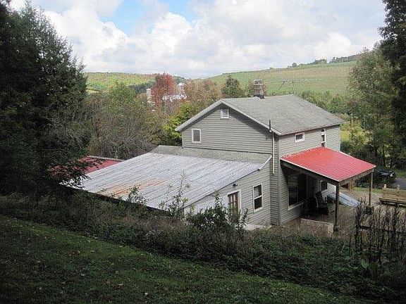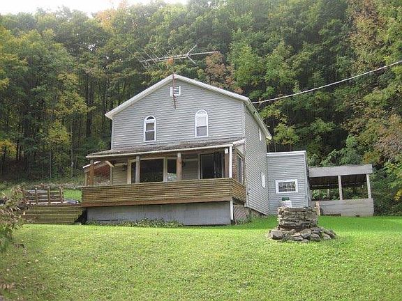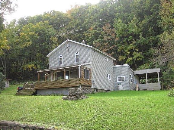 Country farmhouse on .94 Acre lot on quiet sparsely traveled road with covered front porch, decks, attached 1 car garage and storage shed. Fresh interior paint. Vinyl sided. Lovely country setting but not too far out of the village. Two Bedrooms, 1 & 1/2 Baths, eat-in kitchen, dining room and living room with an operating woodstove. Downstairs 1/2 Bath. Upstairs full bath. Nicely landscaped. A gem for the money.