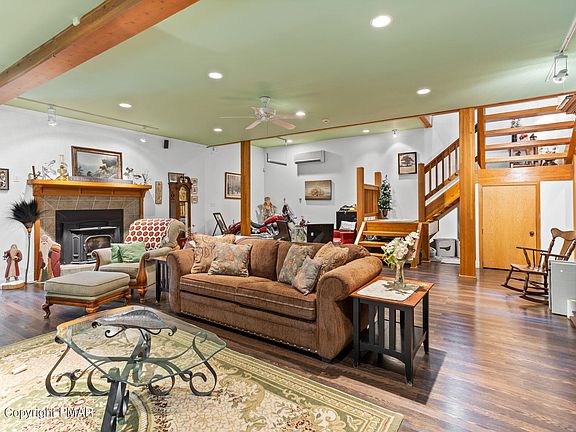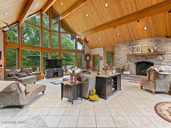 Breathtaking LINDAL CEDAR A-Frame on 6.10 acres w/ detached garage & inground pool in Franklin Township! This dazzling property sports classic mountain features w/ modern taste! The stunning great room showcases soaring tongue & groove ceilings, stacked stone fireplace, gorgeous tile flooring, exposed beams, & a wall of windows looking into the acreage! Open concept gourmet kitchen & dining area w/ double ovens, SS apps, & kitchen island! Cozy up by the Harmon Iron pellet stove in the family room! The library provides bonus space for an at-home office or exercise area! First floor primary suite! Beautifully landscaped w terraced grounds, pond, & snaked driveway! Upgrades abound- composite deck, patio, & machine shop! Minutes to Beltzville State Park, St Luke's Carbon Campus, & PA 476