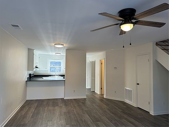 There is no carpet in this home. The appliances in the kitchen are all brand new. Open great room to kitchen. Half bathroom on the main level. The backyard is fully fenced. A storage space with power is accessible from rear patio. Both large bedrooms are upstairs and each has its own bathroom en suite. Easy parking outside the front door. Washer and dryer remain and are in "as is" condition.