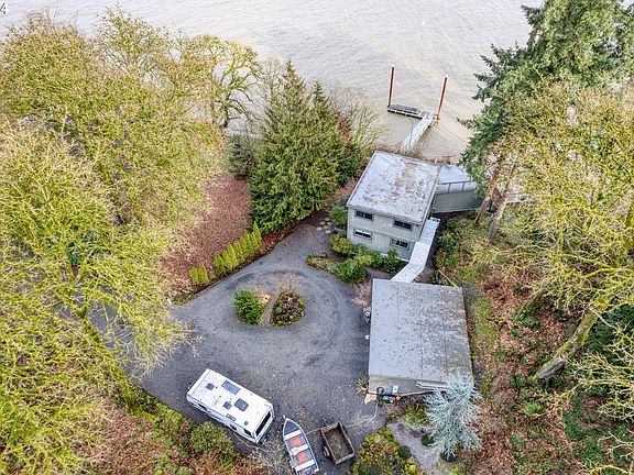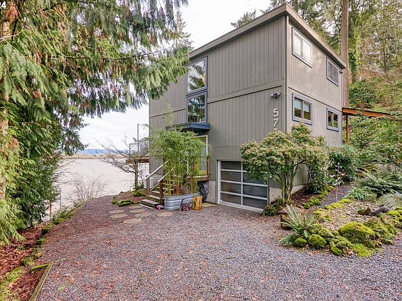 Outstanding home & property with 100 feet of river front & beach access. This home is truly a retreat offering magnificent river & mountain views. Tranquil & dynamic, the Columbia river changes with the seasons. Lots of nature and activity to take in. Beautiful Eagles, Osprey, & many other birds all around. Circular driveway with RV parking. One car attached garage. Permitted 2 car oversized detached garage with 240 volt garage heater. Well appointed home with custom Anderson windows & sliders that expand & contract with the house. Living room with views & turnstyle modern Danish woodstove. Slider to deck. Kitchen with breakfast bar, stainless appliances, ADA non-slip tile floors. Viking gas range, oven, & warming drawer. Solid surface recycled glass counters. Dining room kitchen combo.Dining area has a river view. Main floor laundry room. One main floor bedroom. Owner's suite up with views, large jetted tub, walk in shower and access to upper level deck. 2 additional bedrooms & bathroom up. Lower level has large workshop/bonus room with 220 electric. 50 foot boat slip at Yachts Landing Marina included in list price. $70/month covers maintenance, water, & property taxes. Must see to appreciate this wonderful riverfront home & property.