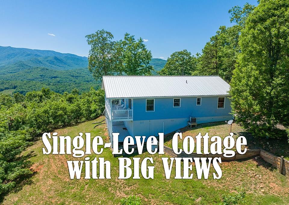 Huge, year-round long-range 180-plus-degree VIEWS await you from every room of this single-level home! This house should be named "Paradise Cottage", as that's how you'll feel about it as soon as you arrive & sit on the covered porch overlooking the most phenomenal mountain views I've seen in WNC. The cottage is absolutely charming & offers easy, one-level living. There's an open feeling in the living room & dining area, which offer easy-care flooring, abundant dual-pane tilt-out windows & gas-log fireplace for warmth & a cozy vibe. The kitchen boasts great cabinet & counter space and, of course, the sink window is set up for you to enjoy the view as you work! There are 2 nice-sized bedrooms, 2 baths, plus a bonus den/office/sleeping room. The primary has an en-suite bath w/jetted tub & convenient washer/dryer closet. This well maintained, one-owner home features hardiplank siding, HVAC system, NEW ROOF, gutters & exterior paint in 2022, great VZ cell signal + a transferable security system. Paradise Cottage is ideal for your full-time, part-time or vacation home and is located in a lovely area featuring paved roads convenient to Franklin NC & Clayton GA.