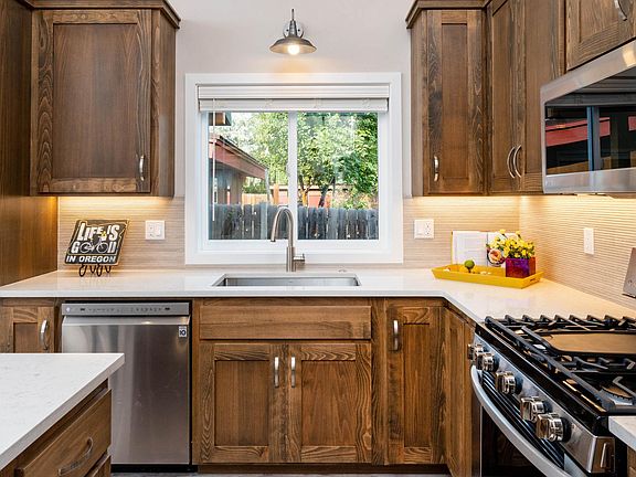 New contemporary construction, a beautiful 2bd. 1 bath home in mid-town! light and airy, with 13 ft tounge and groove ceilings and good natural light The kitchen is equipped with a gas cooking range, side by side refrigerator with Ice and water on the door, a microwave hood, and a energy efficient dishwasher,the pantry has 4 pull out shelves, a pull out spice rack next to the range, and a lazy susan in the corner for easy access to pots and pans.The Island is home to the recycle center, a bank of drawers and more storage. 2 bar stools are provided to enjoy meals at the bar! At the end of the hall behind a metal garage door you will find the washer and dryer, on demand WH, and storage. Each room is equipped with a cadet heater, a mini split in the living room provides heat or AC. Nestled on a quiet alley with a covered carport and extra parking. Enjoy the covered patio year round, outside storage unit, and a Zero scape fenced yard. 3 blocks from the 4th st. food carts and 1 block from mid-town market.This home is sure to make living in Bend a dream come true! Owner pays sewer, water, tenant is responsible for gas, electric and garbage. No smoking. 1 covered parking and 1 street parking. Please don't bother the tenants. showings for screened applicants only.
