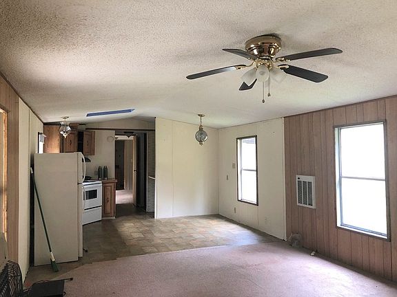 Single-wide mobile home is clean and surroundings are quiet! Front porch invites you into the living room, kitchen with dining area, two bedrooms, one and one-half baths and laundry room. Cook stove, large hot water heater and metal roof are newer. Flooring is needed in some areas. Exterior is wonderful! Mother-in-law suite, four additional outbuildings and detached garage are situate on nine acres. Survey stakes are at the road. If you want in the country, this is it!