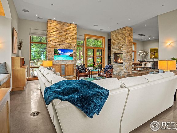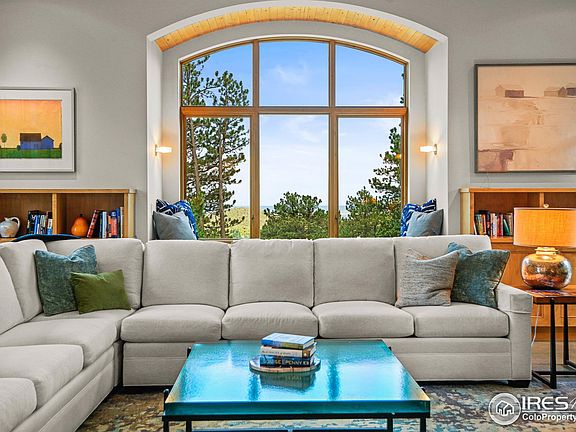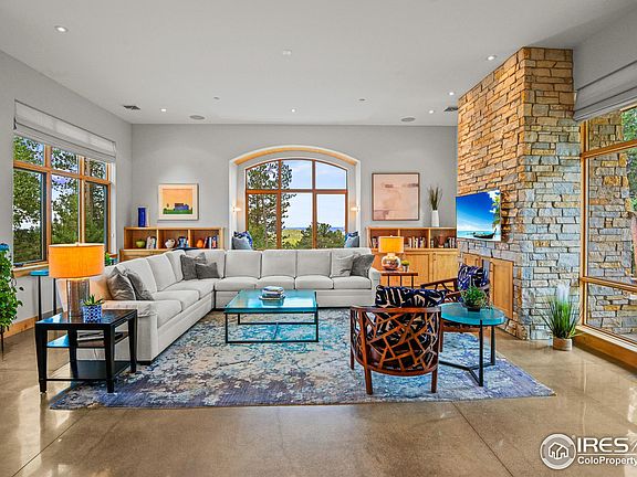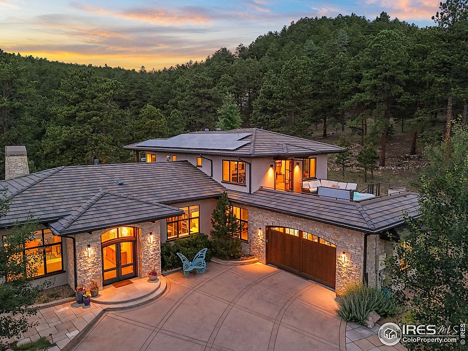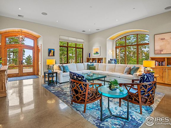 Breathtaking mountain estate on 35 wooded acres just 10 minutes above Boulder. Quite possibly one of the nicest homes in Boulder County, this highly efficient, passive solar home was designed by renowned Scott Rodwin Architecture and brought to life by Skycastle Construction. Enjoy your own private & professionally cut, hiking & mountain biking trail which spans a 1 mile loop across your oasis in the forest. Designed to integrate seamlessly with its natural surroundings, featuring large windows that offer stunning views of the surrounding landscape and to the Denver skyline and the plains below. The exterior uses natural stone, wood and stucco to blend with the environment. Inside, open-concept spaces connect to the outdoors, with decks and patios for outdoor living. 2 sided interior fireplace with a stunning, wood burning, stone fireplace on patio. Passive solar design with owned solar PV system, in floor radiant heat, central air, fire suppression system with cistern, home audio system, wool carpeting, incredible upper deck with near new, salt water hot tub. Impeccable landscaping and hardscapes surround the home