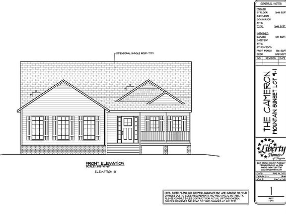 PRESOLD! The NEW CAMERON one level floor plan, located at Mountain Sunset in Louisa. Upgrades include a side load garage, vinyl shake and gable accents, wide window trim, garage door opener, pull down attic stairs, vaulted ceiling with paddle fan in great room and kitchen, extra flush mount lights, 2 extra in great room, gas fireplace option 1, gas range, double bowl vanity, garden bath option, rough in laundry sink, replace microwave with range hood with chimney stack, vent microwave or range hood to outside, 2x7 island with granite, tier 2 42" cabinets, crown molding on kitchen cabinet, granite countertops, optional primary bath & closet enlargement, 5' French door & wall in flex room, install treated band board for future deck, tankless water heater & gas connection, kitchen sink upgrade, fireplace blower & remote, 4 exterior hose bibs, water recirculating loop for tankless water heater, and lot premium. We have 3 lots left in this great neighborhood!