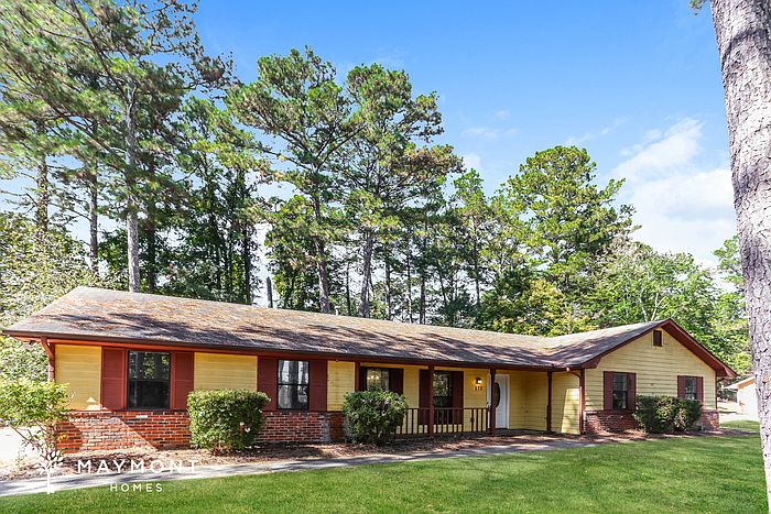 Nestled beneath the shade of tall, whispering pines, this warm and welcoming 3-bedroom, 2-bath home offers a perfect blend of comfort and charm. The inviting front porch, framed by rich brick accents and golden siding, sets the tone for a home that feels both serene and full of character. Step inside, and you'll be greeted by natural light filtering through well-placed windows, giving each space a soft, airy feel.