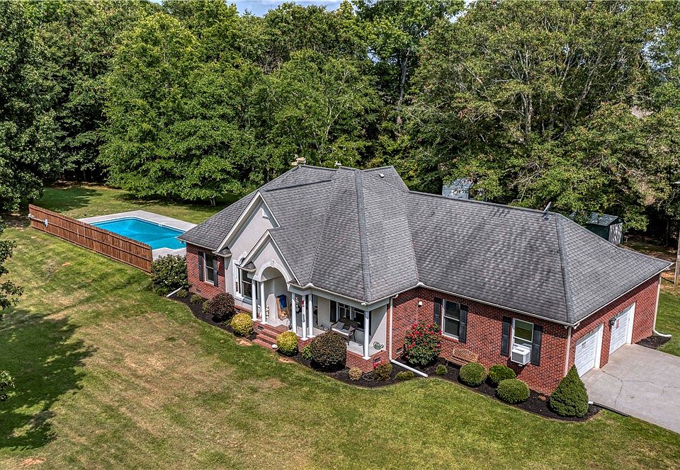 The master suite is a serene retreat, offering a garden tub, walk-in shower, double sinks, and a walk-in closet. Enjoy the outdoors from your front porch or the screened-in back porch, where you can take in the beauty of the well-maintained landscaping. The in-ground pool provides a perfect spot for relaxation and social gatherings.