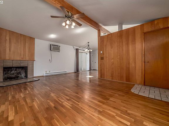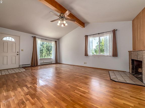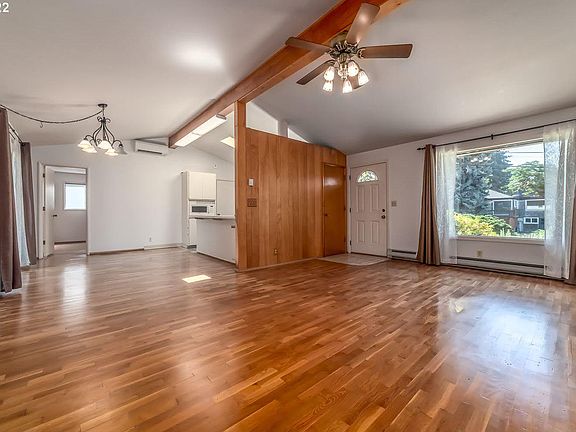 Nice one level Mid Century Modern home in College Hill neighborhood! Home features original wood floors, skylight, wood burning fireplace, vaulted ceilings, fan lights, 2 head ductless ht pump. Primary bedroom w/half bath. Kitchen features flat top stove, dishwasher, BI micro, eating bar. Spacious deck, 2 car garage with small work space with shelves. South Eugene schools.