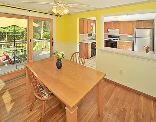 Set well back from the road, a long tree lined driveway welcomes you to this wonderful home in MOVE IN condition nestled on an ACRE of land in a lovely peaceful setting. This well maintained home features new interior paint, newer roof and windows, along with remodeled baths. The heat was upgraded to FHW by natural gas, a solar powered roof vent added, and 200 amp elec service.The main level has hardwood flooring, 4 BRs with large closets, sunny living room, country kitchen, updated bath, and dining room area which leads to a Trex deck overlooking the private rear yard. The lower level has a large front to back family room with triple windows + wood stove/fireplace, new 1/2 bath, an extra room that could be used as a 4th bedroom or office, laundry area, full walkout and access to the one car garage w/new door. Newer windows throughout brings in the natural light.Close to the Green Harbor golf course and a short ride to our beautiful beaches.