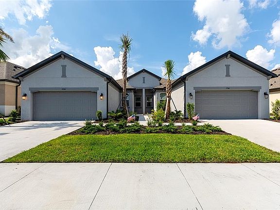 REDUCED AGAIN---Why wait to build? This lightly lived in (Ruby floor plan) villa, one year old, better than new 2/2 plus den, two car garage with epoxy finish, is ready for a new owner! M/I built, with quartz countertops, white cabinetry, neutral gray plank tile floors and paint, has enough room for everyone. Spacious owner's suite with water view, spacious walk-in closet, upgraded owner's bath with double sinks and upgraded lighting. The split second bedroom also has an upgraded bath, walk-in shower, and upgraded lighting, Doors have been added to the den post construction for added privacy. So if you are working from home, or just want another quiet reading space, or TV room, close the doors and retreat! Window coverings include white, faux wood blinds and vertical blinds covering the sliding glass doors to the open lanai. Off the kitchen is your laundry room with cabinets above. Your kitchen is the heart of the home with a spacious pantry, stainless appliances, and open to the family room so the chef can be a part of the conversation! Add a couple of bar stools to the counter and enjoy a cool beverage and appetizers before enjoying dinner alfresco on your lanai with water view. This gated community (Amberly) located on the north east side of Caruso Rd. is maintenance free and offers a community pool. Close to shopping, banking, restaurants, worship centers, beaches, and I-75 for commuting to Sarasota, St. Petersburg or Tampa. This would make an affordable lock and go second home, or full time first home!