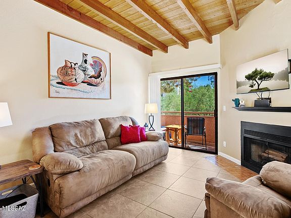 Welcome to your Foothills retreat, where timeless charm meets modern comfort. This beautifully maintained 2-bedroom, 2-bath condo in desirable District 16 features exposed beam ceilings, a cozy wood-burning fireplace, and an open, light-filled floorplan. The updated kitchen offers a new stainless stove and a new dual-basin sink with freshly painted cabinetry. Enjoy peace of mind with a brand-new HVAC system (2025 with 10 year warranty), newer water heater (2023), and an in-unit stackable washer/dryer. The spacious primary suite includes a large walk-in closet. Step outside to the serene grounds with streams, bubbling fountains, a sparkling pool, spa, and the clubhouse. Move-in ready and full of Catalina Foothills charm! Low maintenance living at it's best!