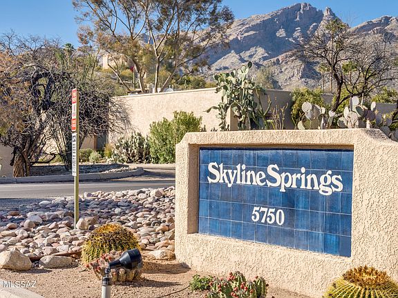 Come see this tastefully furnished 2 BR and 2 BA condo in the heart of the Catalina Foothills! Located in desirable Skyline Springs, this north facing ground floor unit is ready for you to move in! All appliances and furnishings are included. Open and airy, with a large MB and oversized walk-in closet, nice size second bedroom, wood burning fireplace, fully equipped kitchen and a private balcony with mountain views! Close to shopping, dining, golf, hiking, biking and schools, wonderful central Foothills location. The HOA covers water, trash, roof, exterior maintenance, and the complex has a heated pool, spa and rec room, with mature palm trees and beautifully maintained gardens! Your cozy condo is waiting for you!!