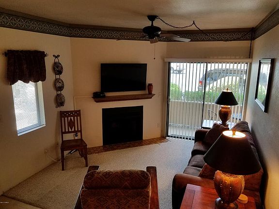 Condo located on 1st Floor/ end unit in Skyline Springs Condominiums. 2 bedrooms, 2 bath with Fireplace. King bed in Master bedroom with walk-in closet. Master Bathroom with Walk-in Shower. Queen bed in Guest Bedroom, guest bathroom with tub. All appliances including electric stove, dishwasher, microwave, refrigerator, washer and dryer. Community pool,spa and BBQ grills. Open parking, covered north facing patio with mountain views. Assistive animals only. Rate May - Dec is $995/month (utilities not included). Rate Jan -April is $2,150/month.