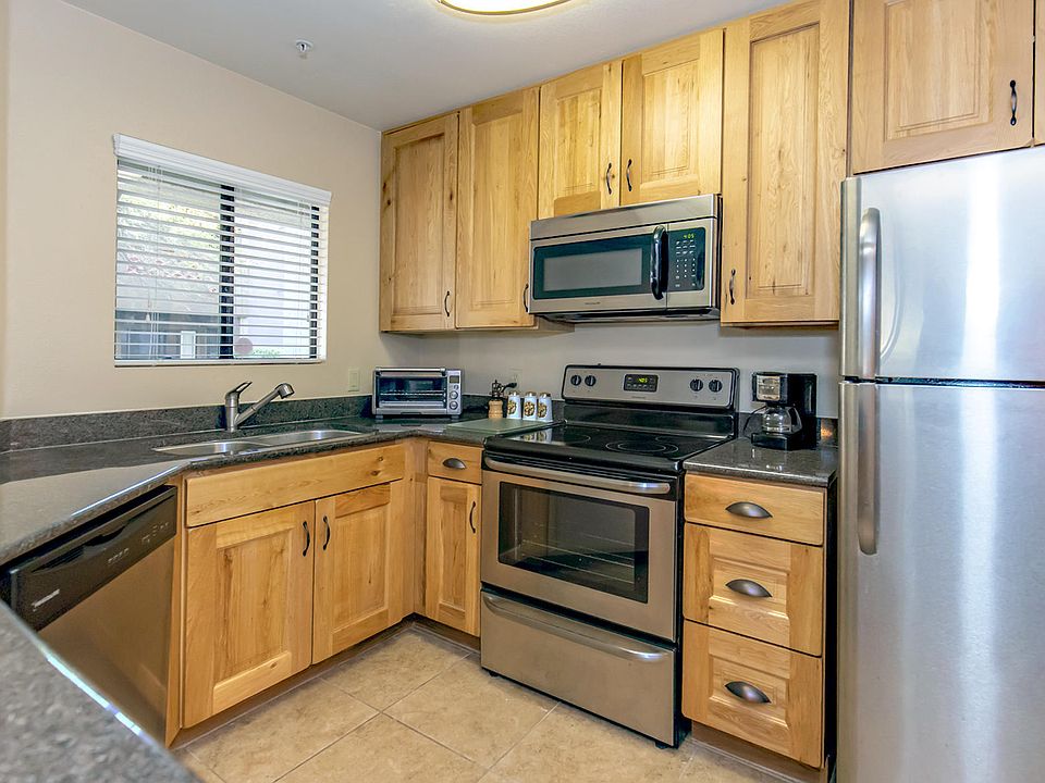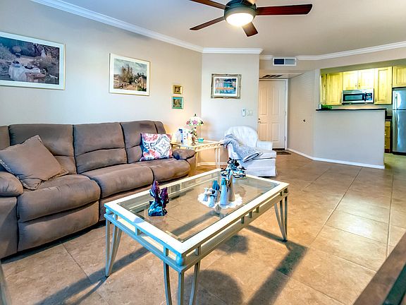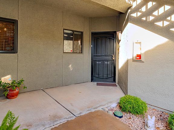 Nicely updated ground unit features upgraded cabinets, stainless appliances, full slab granite counters and custom painting. Crown molding and baseboards. Ceramic tile floors in all but 2nd bedroom which has carpet. NEW AC this past year. Ceiling fans in living room & bedrooms. Private patio with some mountain views. HOA includes 24 hour fitness center, 2 sparkling pools w/spas & clubhouse on site HOA management on site, gated entry. Handy for shopping, dining and Sabino Canyon access.