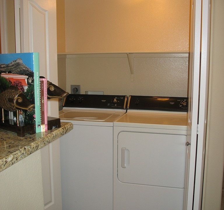 Great ground floor location! Welcome home to tile everywhere but your bedroom, White and bright kitchen with walk in pantry and smooth top electric stove! Washer and dryer included. The storage space in this place is unbelievable! Besides your walk in pantry and washer closet, you also have a HUGE hallway linen closet, walk in closet in the bedrooms well as an outdoor storage closet! Spacious great room opens up to your private patio, adjacent to a grassy common area. You can hear the water feature from your patio.Close to one of two pools, large grass area and one of many ramada's featuring gas grills and picnic tables. 24 hour gated access community also features a fitness center. In close proximity to shopping, dining, banking