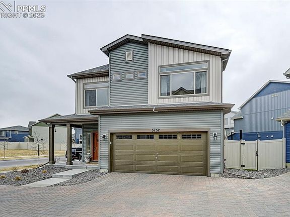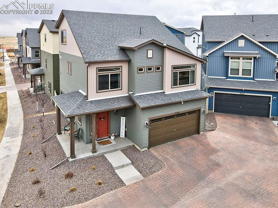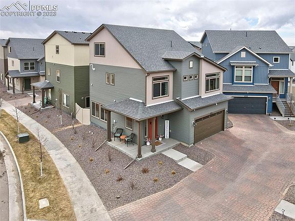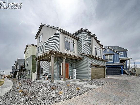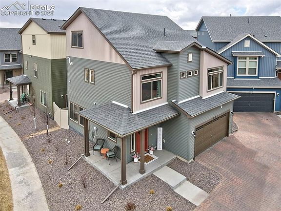 This home and its modern architecture is strikingly beautiful. Walking in the front door into the spacious front entry you're met with an instant feel of home with the dark wood colored flooring. The main floor living room is is a cozy space that leads into the expansive kitchen that boasts ample cabinet space and a large center barstool height island. Through the kitchen glass sliding doors lead into the backyard with a great patio space for entertainment. The upper level hosts a family room loft space, three bedrooms, and two baths including the master bedroom and ensuite bath. This property has it all and is minutes away from schools, hiking/biking trails, pools/parks, pickle ball courts and dog park. This home is located in the Banning Lewis Ranch community with amenities galore, including neighborhood schools, over 75 acres of parks/trails/open space, tennis courts, basketball court, rock climbing parks, zip-lines, access to pools, splash pad, water park, and dog park. Recreation center houses a fitness center and also regularly hosts classes and events for all ages. In the summer months, catch a neighborhood concert, festival, food trucks, farmers market or enjoy other regular community events. This community has it all.