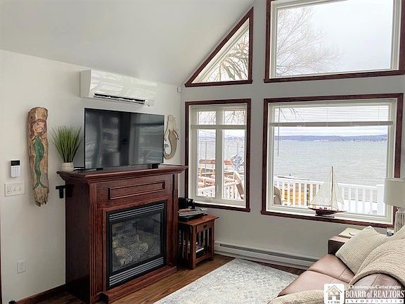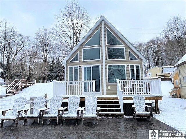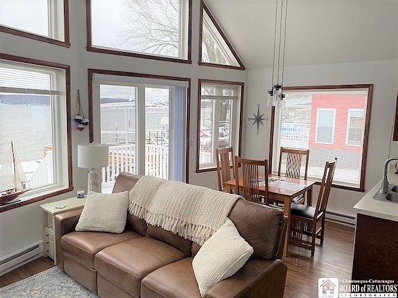 Relax and enjoy this newly built 2 bedroom, 1 bath Lakeside retreat. Great Chautauqua Lake location on a quiet street. This year round home was built in 2018 and features an open floor plan, spacious first floor bedroom with large closet, second floor loft, vaulted ceilings, poured foundation and floor, a gas fireplace, spectacular views from floor to ceiling windows facing the lake, bath room with tile floor and laundry conveniently located on the main floor. Newly added central air with two heat zones as well as a newly installed Aprilaire dehumidifier in the crawl space. The property also includes a new water well, septic and sump pump. Outside you will enjoy the beautiful view of the lake while sitting out on your Trex deck or new stamped concrete patio. New dock is also included. Purchaser has first right of refusal on the lot next door. This lot will add great value as this will allow you to expand or build. Delayed negotiation until Saturday March 11, 5pm.