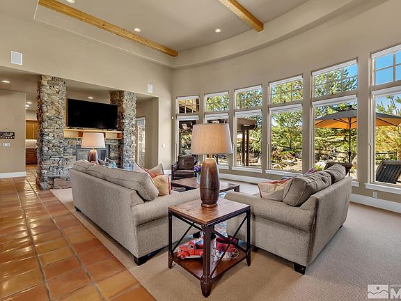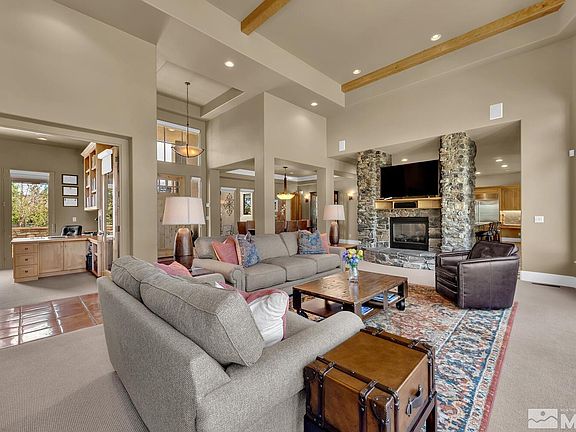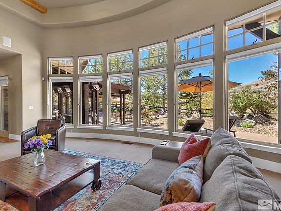 This stunning home is located on a private cul de sac in the Muirfield Villas neighborhood in gated ArrowCreek. It is a rare single story Birkdale model consisting of 3212 square feet with 3 bedrooms, 3 1/2 bathrooms plus an office with custom built-ins located on 0.59 acres. The open floor plan offers abundant natural light with spectacular mountain views., The great room design is open with 30 feet ceilings with hand-hewn beams and showcases a cascade of windows with spectacular mountain views. There is a 2 way rock faced gas fireplace shared with the gourmet kitchen.The gourmet kitchen is a chef's delight with a large granite island, granite counters with lots of cabinets, Sub-Zero refrigerator, stainless steel Thermador appliances, commercial grade 6 burner gas range with double ovens, built in microwave, large pantry and a kitchen nook.The master bedroom has mountain views, double doors leading to private outdoor sitting area, a large walk in closet, jetted Jacuzzi tub, walk in shower, granite countertops with dual sinks, separate toilet closet and a slate bordered gas fireplace. The other 2 bedrooms are on the other side of the home and has its own full bath with walk in showers. One bedroom has a Murphy bed which is included for those extra guests. Home office has attractive built-in bookcases and desk with access to the private front courtyard. Custom crown molding, baseboards, tile and slate flooring, beautiful overhead chandeliers, scones and recessed lighting throughout the home. Built-in Sonos sound system (indoors and outdoor). Low maintenance landscaped backyard offers panoramic mountain views, attractive patio with trellised sitting area, handsome rock walls, mature trees and views of ArrowCreek Golf Course and the western slopes of Mount Rose. Private front courtyard with attractive beams and stone walls. Walking distance to Harbottle Park which has a playground, bocce ball, fountains and barbecue area. Complimentary access to amenities of ArrowCreek Residents Club such as swimming pools, tennis courts, basketball courts, soccer field and workout facilities. ArrowCreek has a 36 hole private golf country club with different membership opportunities available. Close nearby hiking and biking trails. ArrowCreek is located approximately 25 minutes from snow skiing at Mt. Rose, 35 minutes from Lake Tahoe and 25 minutes from the Reno/Tahoe Airport. Close to library, Truckee Meadows Community College, Summit Shopping Center which includes the Apple Store, Century Theaters, Dillards, Williams Sonoma, Pottery Barn, Ann Taylor, and a number of other popular retail outlets and eateries.